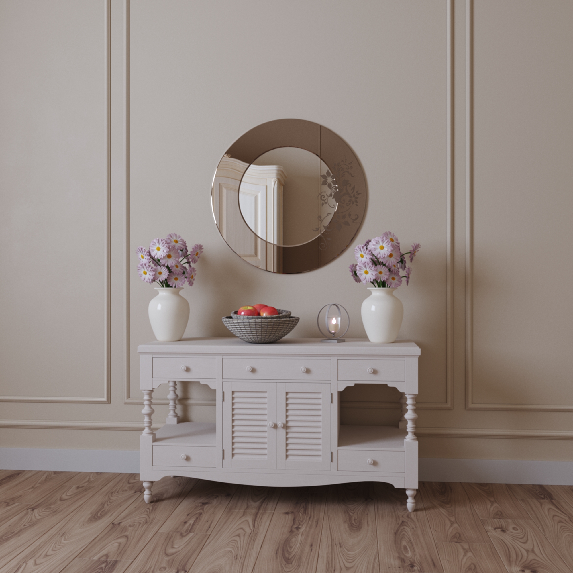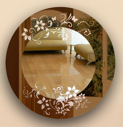 Оригинальное круглое зеркало "Виола" с золотистым рисунком, оформленное полированной кромкой по периметру. Это зеркало с легкостью может стать частью композиции из зеркал разных форм и размеров, например, в тонких золотистых рамах. Идеально сочетается с предметами декора в стиле Классика, Арт-Деко, Винтаж. Прекрасно смотрится в интерьере ванной комнаты, спальни, гостиной.