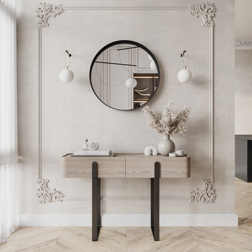 Круглое зеркало в металлической раме "Раунд" отлично смотрится в интерьерах с однотонными покрытиями как светлых, так и темных тонов. Благодаря сдержанному дизайну модель не конкурирует с другими элементами декора, а органично дополняет интерьер. Чистота формы, фунциональность, хороший вкус и легкость. .Это зеркало идеально подходит  для минималистичных интерьеров, а также интерьеров в стиле "Лофт".
