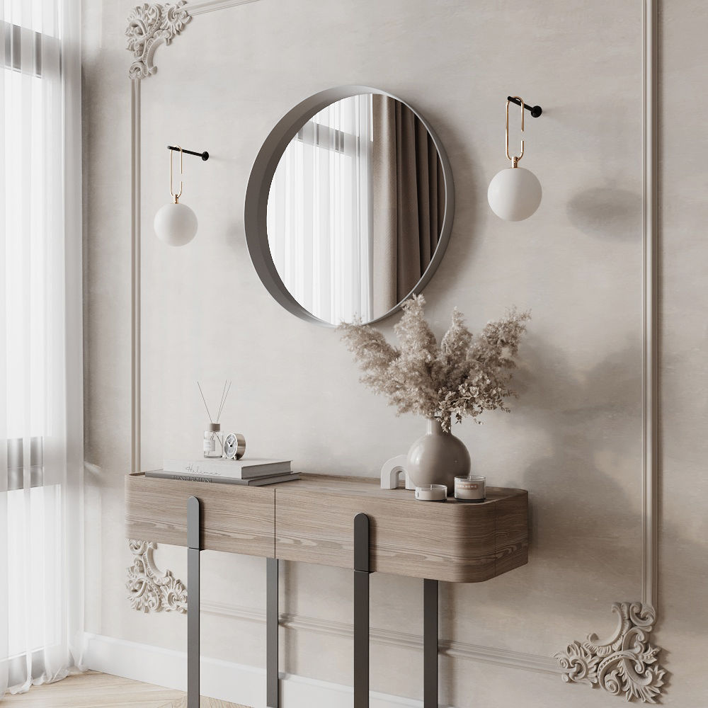 Круглое зеркало в металлической раме "Раунд" отлично смотрится в интерьерах с однотонными покрытиями как светлых, так и темных тонов. Благодаря сдержанному дизайну модель не конкурирует с другими элементами декора, а органично дополняет интерьер. Чистота формы, фунциональность, хороший вкус и легкость. .Это зеркало идеально подходит  для минималистичных интерьеров, а также интерьеров в стиле "Лофт".