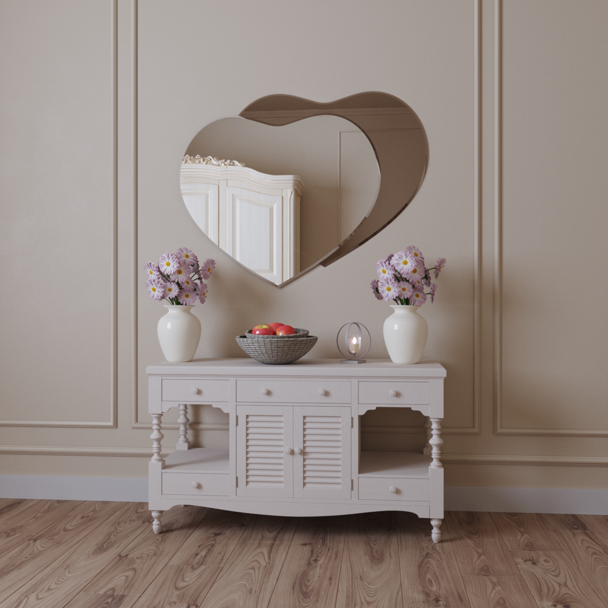 "L'amour vers soi-même est le début du roman qui dure toute la vie"…  Любовь к себе — это начало романа, который длится всю жизн (с). Побалуйте себя нежным и романтичным зеркалом "Амур- 2", которое органично и уместно будет смотреться в интерьере небольшой гостиной и конечно же спальни. Зеркало "Амур-2", оформленное фацетом  по периметру изделия, безупречно сочетается с ароматом белых роз в дизайнерской вазе.